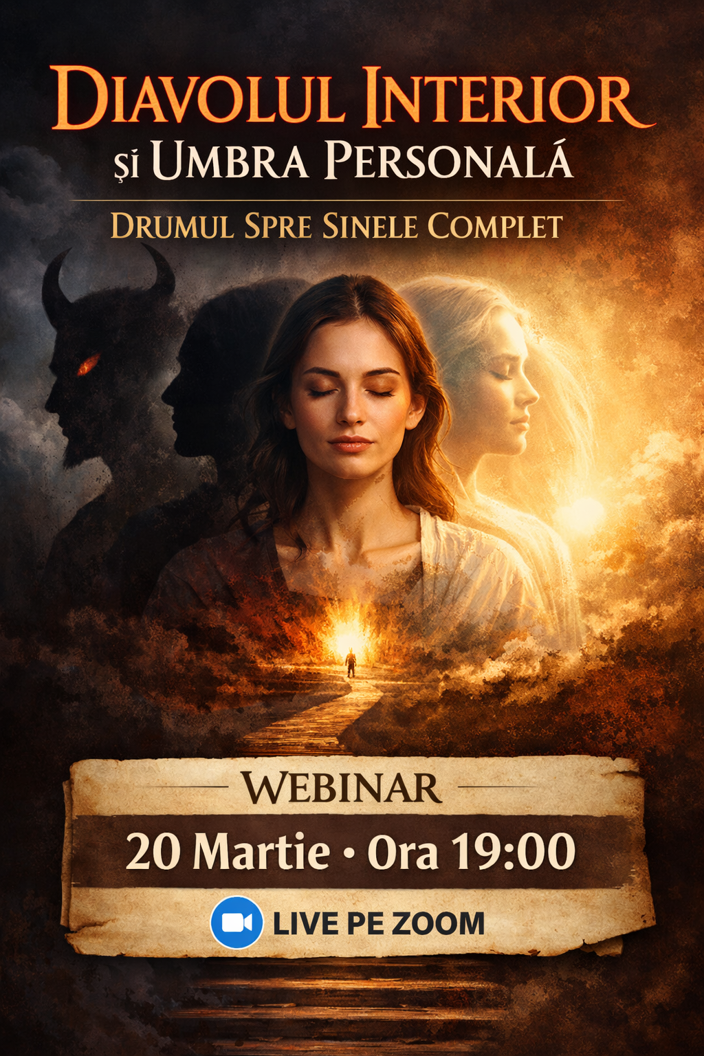 Acest webinar este o călătorie profundă în psihicul uman, dedicată descoperirii și integrării aspectelor ascunse ale personalității tale – umbrele, temerile, dorințele reprimate și "diavolul interior". Vei învăța cum să recunoști aceste părți ale sinelui, să le confrunți și să le transformi într-o resursă puternică pentru creștere personală și echilibru interior.Ce vei descoperi:Ego și Umbra – cum să recunoști părțile reprimate ale personalității și să nu le mai lași să te saboteze.Anima și Animus – echilibrarea laturilor feminine și masculine din tine pentru a crea armonie interioară.Sinele și individuația – cum să atingi completitudinea și autenticitatea prin integrarea tuturor aspectelor psihice.Strategii practice – metode de introspecție, exerciții de conștientizare și instrumente pentru transformarea interioară.Acest webinar nu este doar teoretic – este un ghid practic și inspirațional pentru oricine își dorește să înțeleagă mai bine propria minte, să înfrunte provocările interne și să trăiască o viață autentică și echilibrată.Cine se poate înscrie:Persoane interesate de dezvoltare personală și psihologie profundăCei care doresc să înțeleagă și să transforme conflictele și umbrele interioareOricine vrea să-și atingă sinele complet și să trăiască cu mai multă conștiență și echilibru.